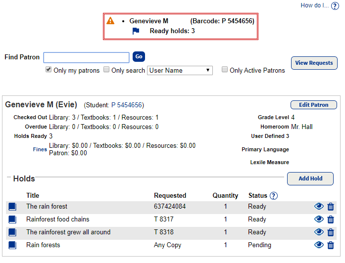 Click the View icon, View icon, to see the hold queue on the Holds On Title page.