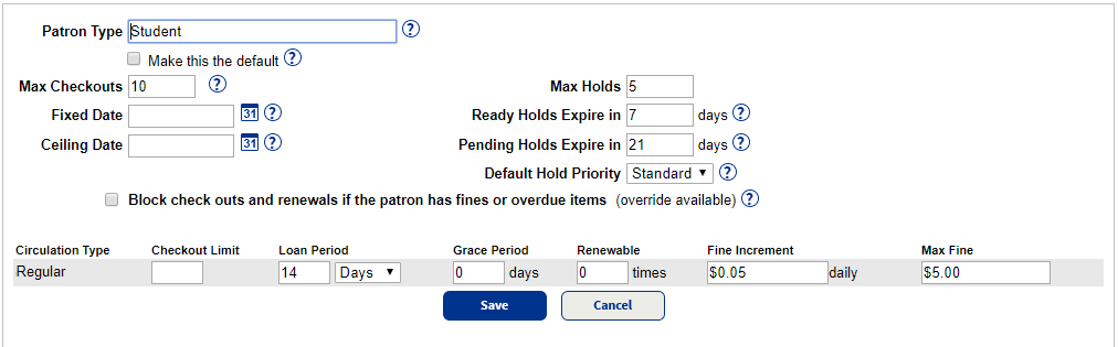 - Max Checkouts: Number of copies of all Circulation Types a person of this Patron Type can check out at any time.